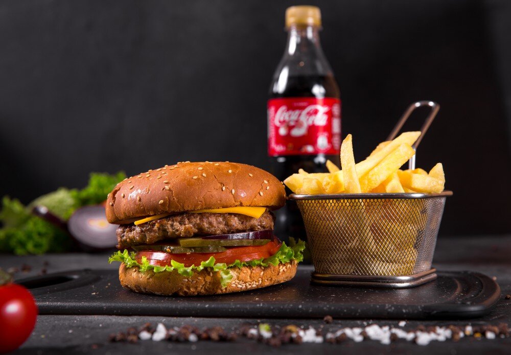 Чизбургер/Гамбургер Говяжий + Фри картофель стандарт + Coca-Cola 0,5л. * экономия 250 тенге