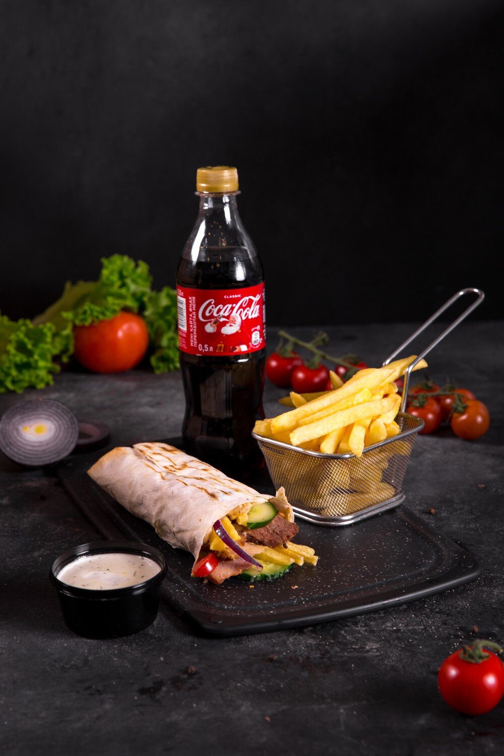 Донер Ассорти стандарт + Фри картофель стандарт + Coca-Cola 0,5л. * экономия 250 тенге