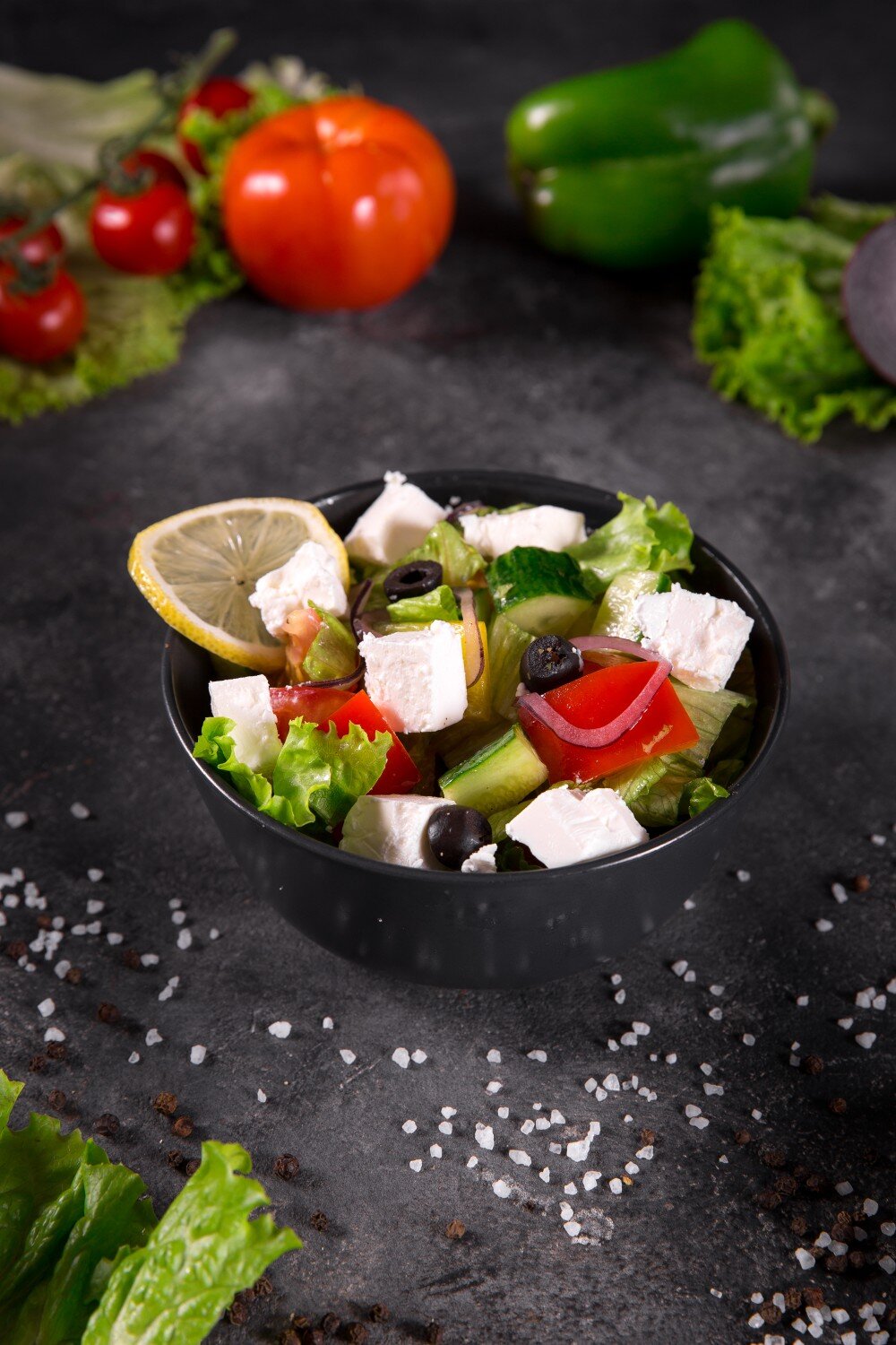 Нежный сыр фета, свежие листья салата, хрустяшие свежие огурчики, спелые томаты, болгарский перец, резанные оливки, красный лук, сок лимона, ароматные специи, оливковое масло.