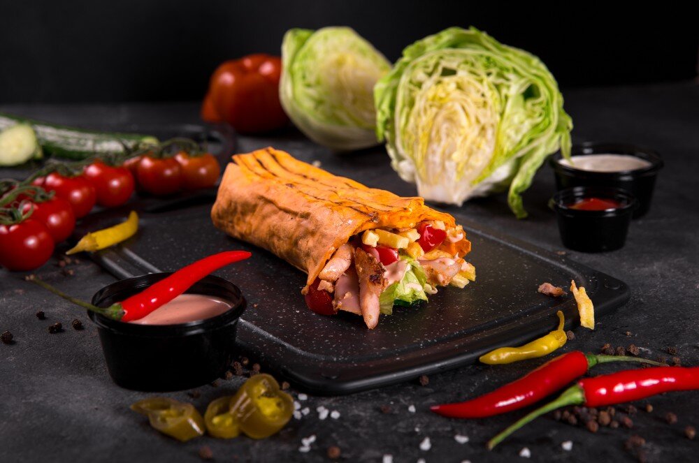 Лаваш, сочное мясо курицы с хрустящим салатом, новый фитнес соус, картофель фри, кетчуп, свежие огурчики и спелые томаты