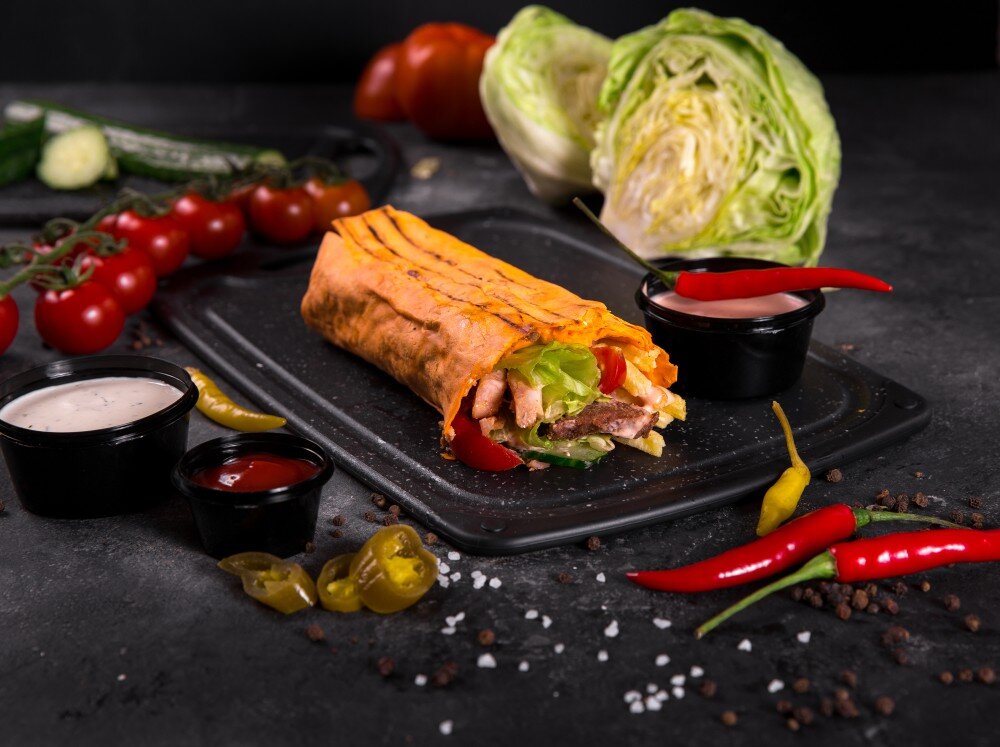Лаваш, ассорти из нежного мяса курицы и говядины с хрустящим салатом, новый фитнес соус, картофель фри, кетчуп, свежие огурчики и спелые томаты