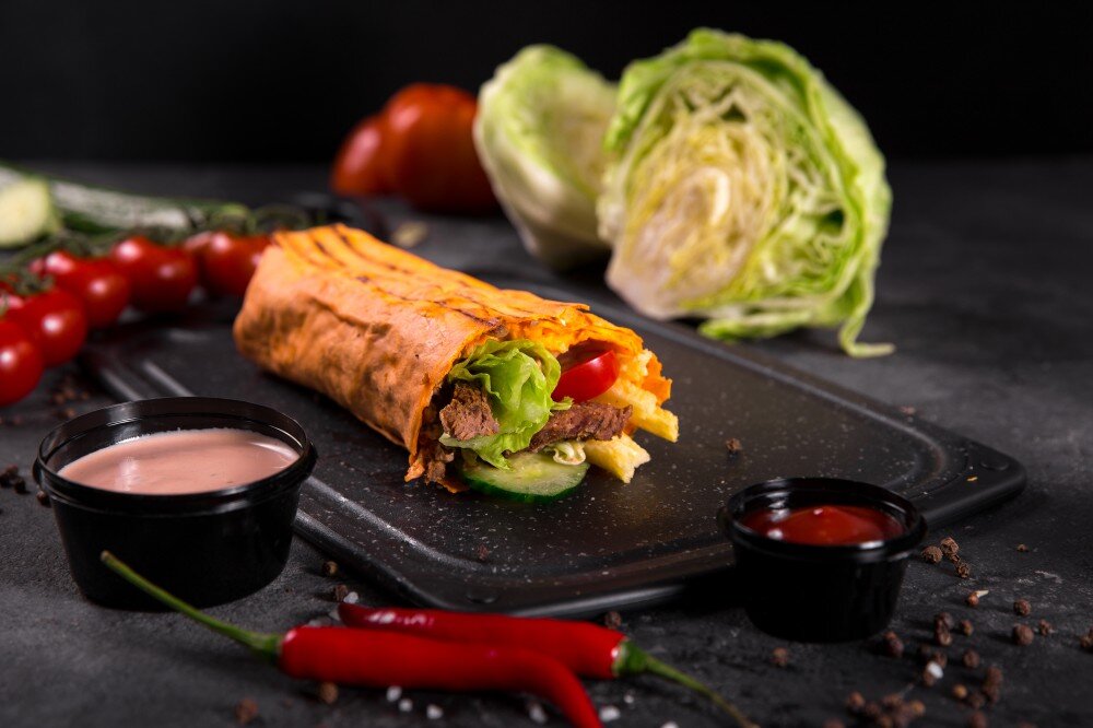Лаваш, нежное мясо говядины с хрустящим салатом, новый фитнес соус, картофель фри, кетчуп, свежие огурчики и спелые томаты